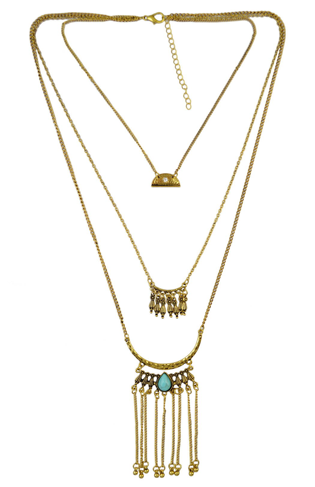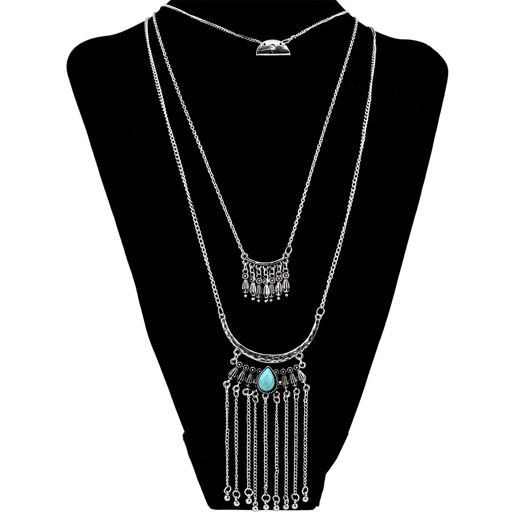 Product: Bohemian 3 Multilayers Gold Silver Plated Long Tessel Chain Pendant Natural Turquoise Beads Necklace