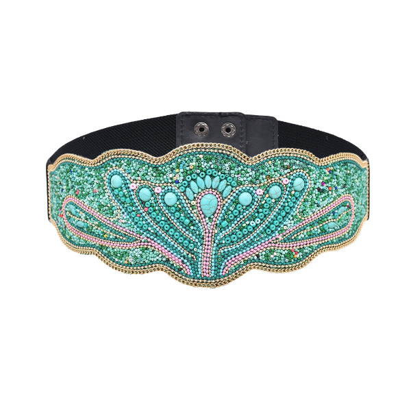 Product : N-8069-GR/PI/PU Flower Rice Bead Women Belt Ethnic Statement Wide Elastic Body Belt for Girls Women Dancing