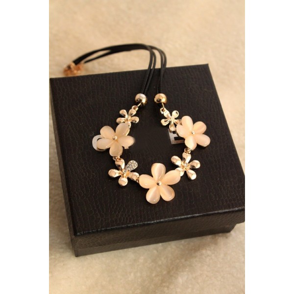 Product:Korea style double leather chain rhinestone cat's eye five petal flowers choker necklace