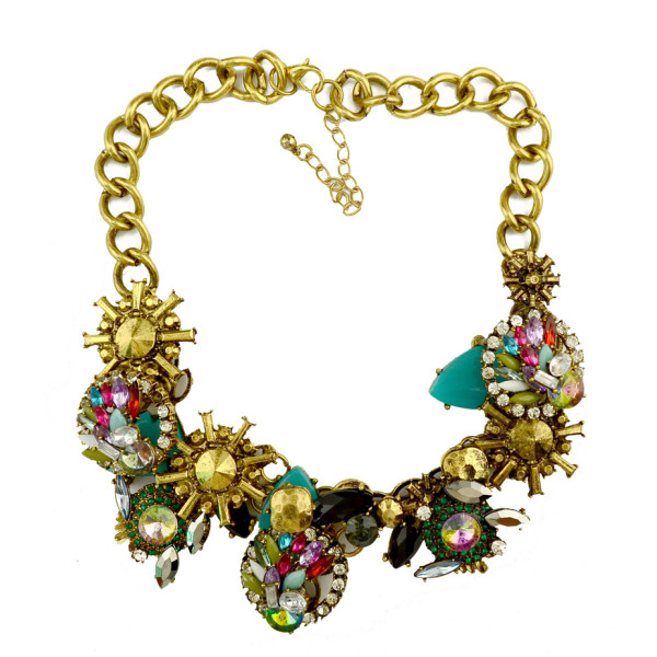 N-3982 European Vintage Style Golden Colorful Rhinestone Resin Gem Flower Choker Statement Necklace