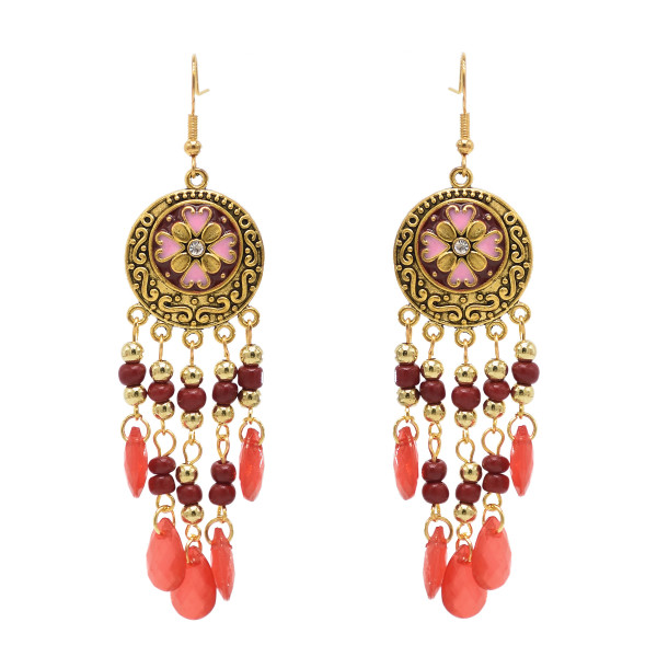 Product: E-6473 5 Colors Ethnic Boho Dangle Bohemain Acrylic Beads Long Tassel Earrings for Women Carved Flower Indian Party Birthday Jewelry Gift