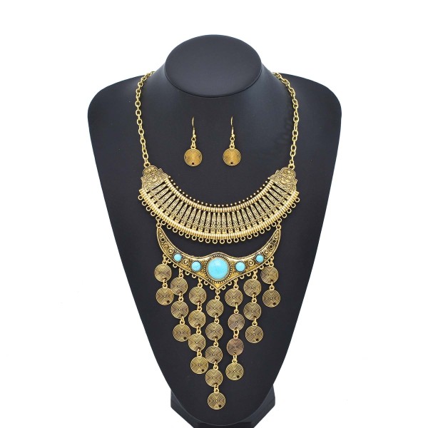 N-8078 Vintage Gold Silver Circle Long Tassel Moon Choker Necklace