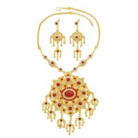 N-8004 Golden Thai Ethnic Red Rhinestone Crystal Flower Necklace Earring Set